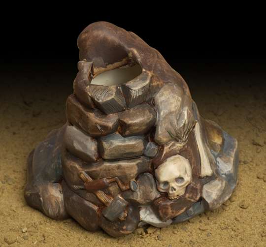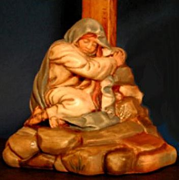 The Passion SetTM Mary Magdalene is draped mournfully around the base of Jesus' cross . This piece is designed so that Jesus can be removed from the cross, and the base turned around to hide Mary Magdalene after Good Friday. Bodies were normally left on the cross to rot after crucifixion, hence the skull at the base of the cross from a previous execution. |
